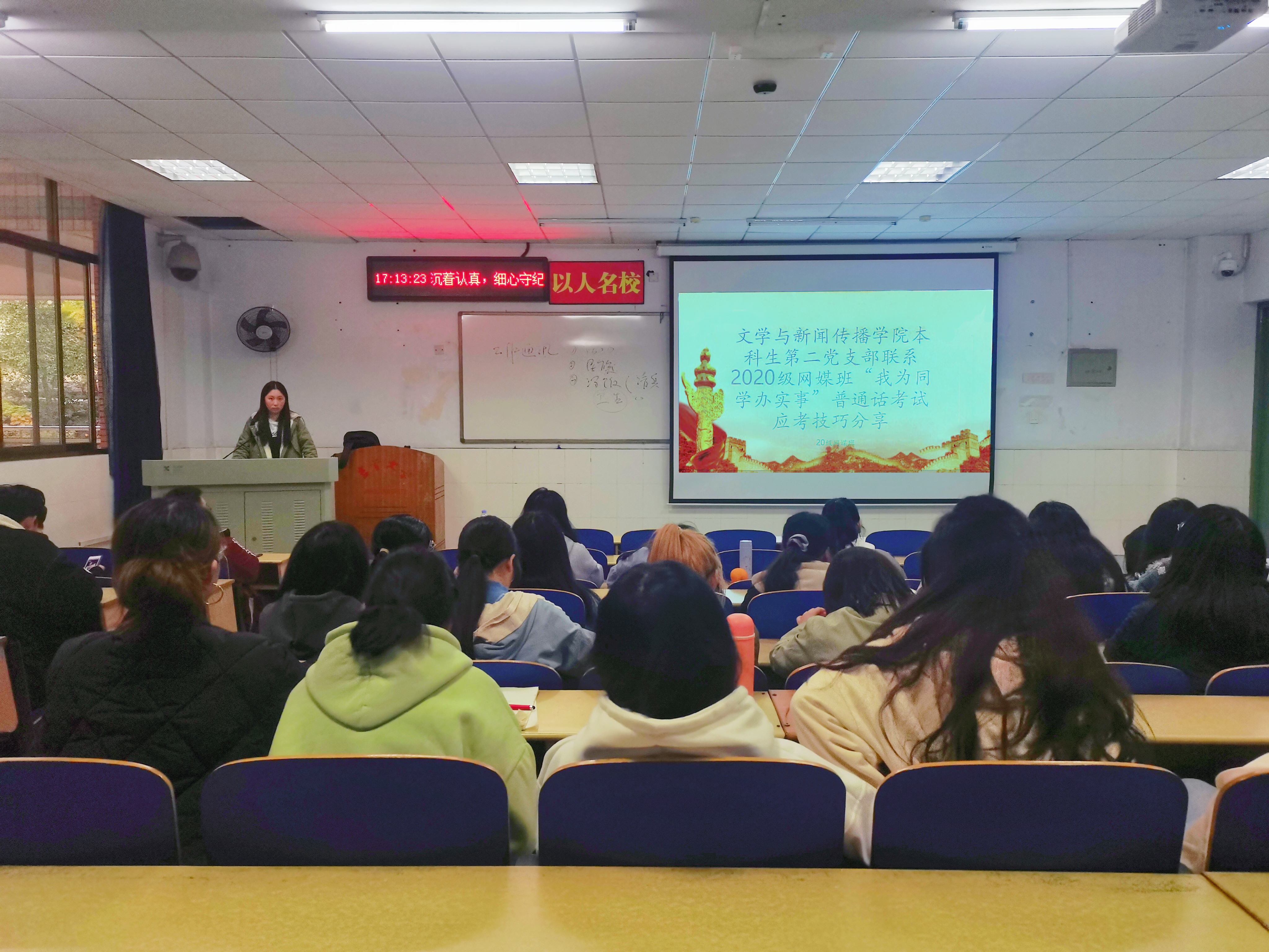 本网讯(通讯员 黎乃可 黄思语)全国大学英语四、六级考试即将在十二月进行。为了让同学们更深入地掌握考试技巧,在考试时更胸有成竹。mk体育官网本科生第二党支部联系2020级网媒班于11月30日在砂子坳校区第六教学楼60213教室举办“我为同学办实事”四级考试技巧分享会。会议由班级学习委员王梦婷主讲。