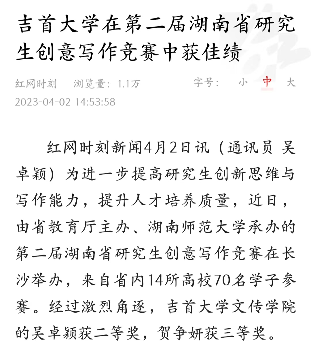 红网时刻新闻4月2日讯(通讯员 吴卓颖)为进一步提高研究生创新思维与写作能力,提升人才培养质量,近日,由省教育厅主办、湖南师范大学承办的第二届湖南省研究生创意写作竞赛在长沙举办,来自省内14所高校70名学子参赛。经过激烈角逐,MK体育,MKsports,mk体育官网的吴卓颖获二等奖,贺争妍获三等奖。