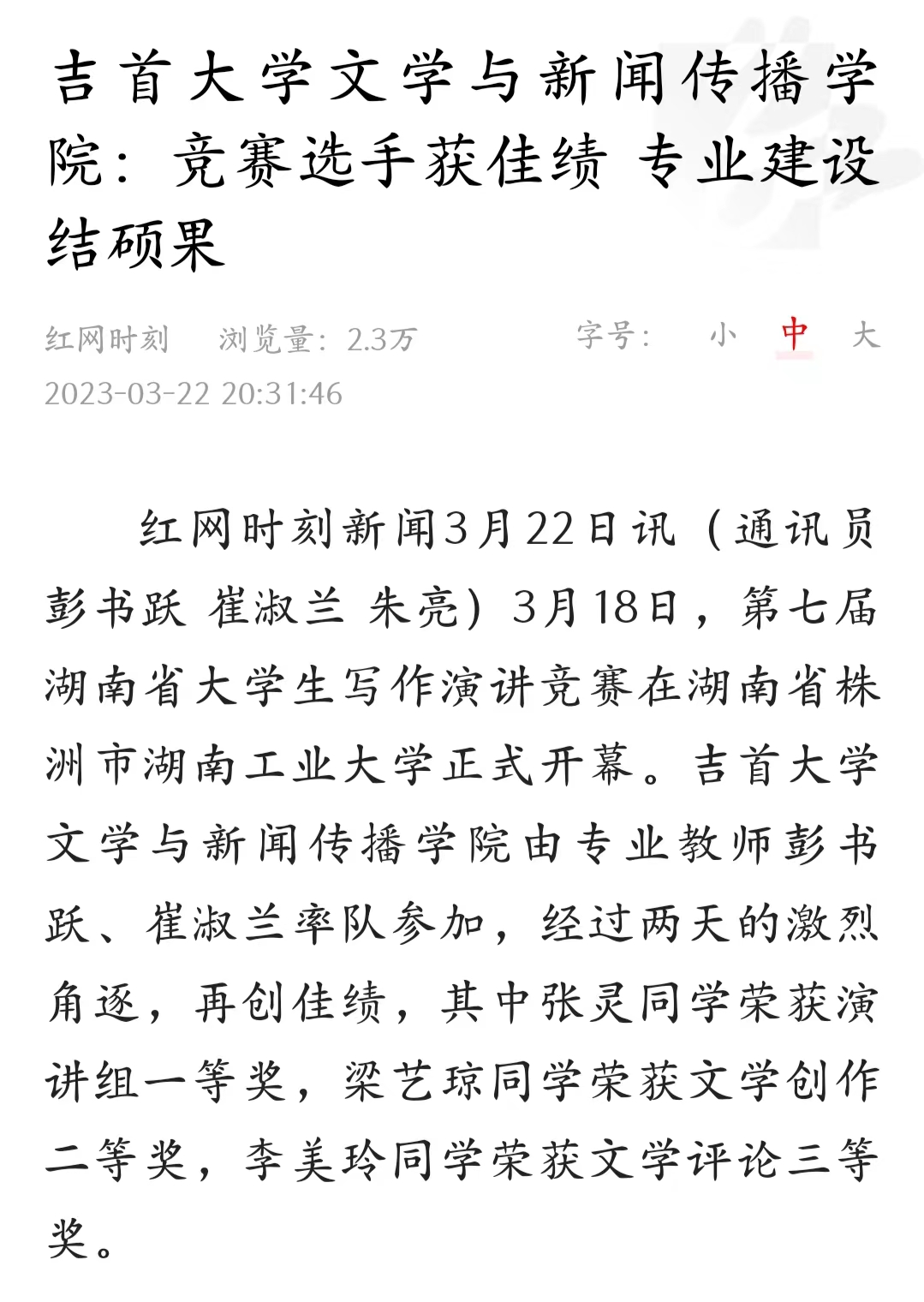 红网时刻新闻3月22日讯(通讯员 彭书跃 崔淑兰 朱亮)3月18日,第七届湖南省大学生写作演讲竞赛在湖南省株洲市湖南工业大学正式开幕。MK体育,MKsports,mk体育官网由专业教师彭书跃、崔淑兰率队参加,经过两天的激烈角逐,再创佳绩,其中张灵同学荣获演讲组一等奖,梁艺琼同学荣获文学创作二等奖,李美玲同学荣获文学评论三等奖。