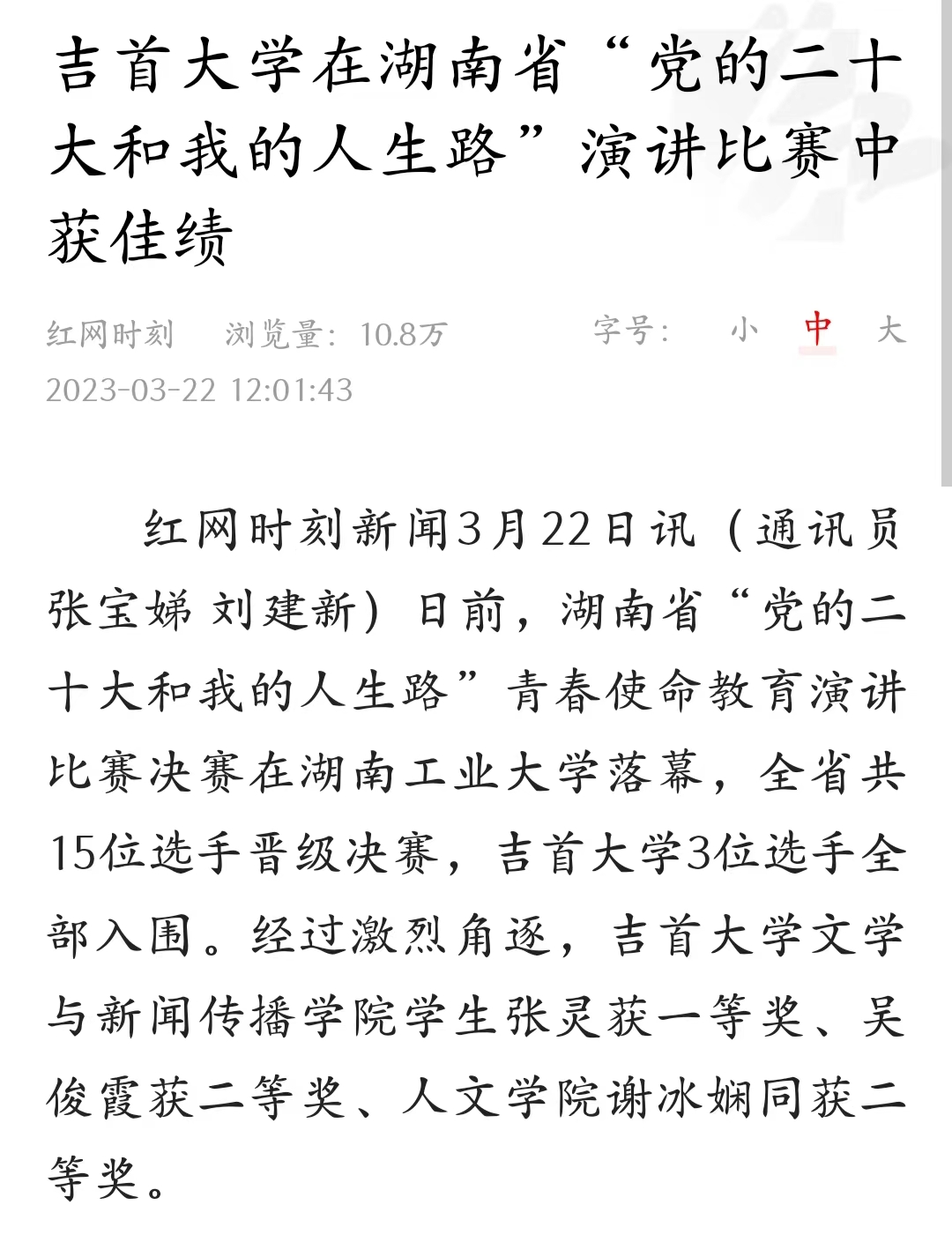 红网时刻新闻3月22日讯(通讯员 张宝娣 刘建新)日前,湖南省“党的二十大和我的人生路”青春使命教育演讲比赛决赛在湖南工业大学落幕,全省共15位选手晋级决赛,mk体育官网3位选手全部入围。经过激烈角逐,MK体育,MKsports,mk体育官网学生张灵获一等奖、吴俊霞获二等奖、人文学院谢冰娴同获二等奖。
