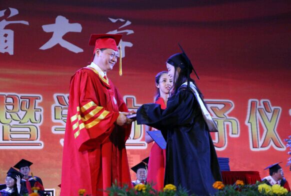 图为 罗惠缙恭请白校长颁授学位 (武景 摄) 院长罗惠缙恭请白校长颁授学位。他对毕业生学有所成表示祝贺,对他们为学院作出的贡献表示感激,并对同学们提出殷切希冀。他希望同学们坚持理想、坚持担当、坚持乐观的正能量,收获人生中的凯旋之门,成功之门,幸福之门。最后,他祝同学们都实现‘昨天你对我爱理不理,明天你对我高攀不起’的神话,精彩的发言赢得同学们阵阵掌声。