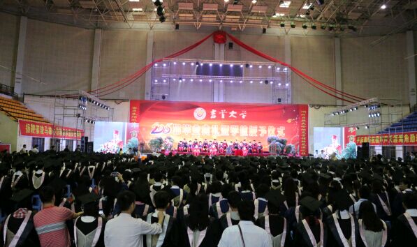 图为 毕业典礼现场 (武景 摄) 校党委书记游俊代表学校宣布2015届学生毕业。他对毕业生提出三点建议:终身学习、创新创业、懂得感恩,并祝愿毕业生们前程似锦。