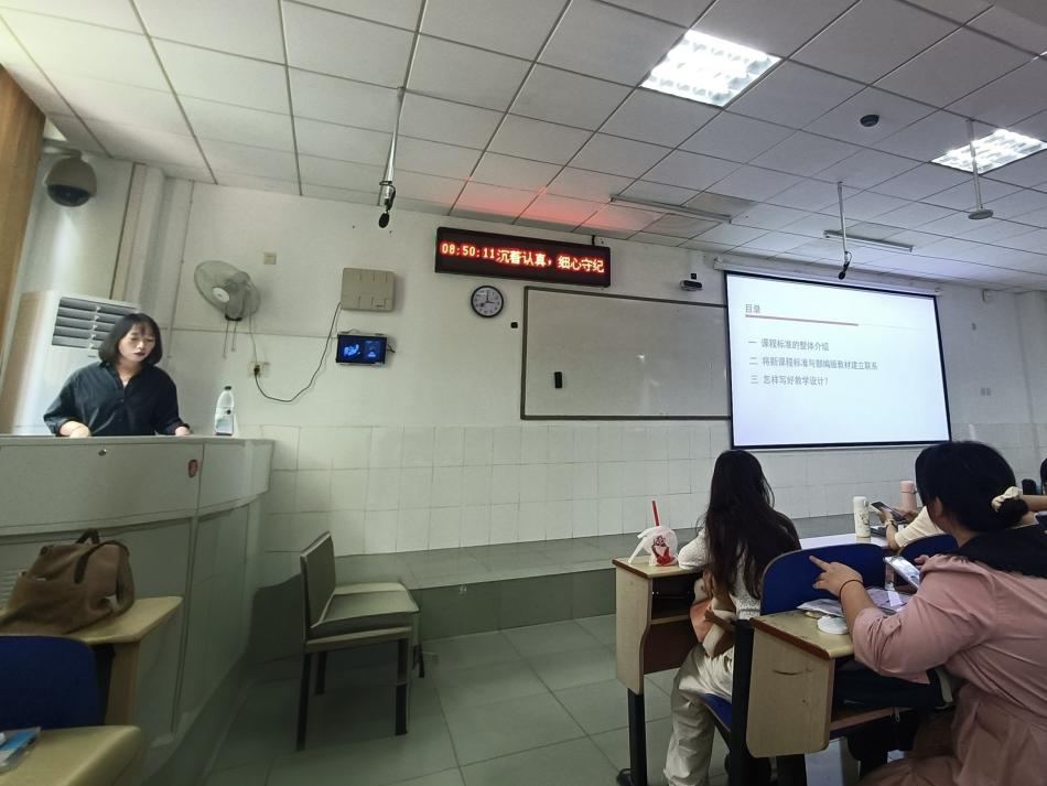 龚瑶进行课程标准的整体介绍,总结归纳了课标重点。她着重强调了要将《义务教育语文课程标准》(2022年版)与部编版教材建立联系,表示师范生在大三阶段要充分利用校内课程完成这种联系的建立。龚瑶以自身教学设计为例,详细介绍了怎样写好教学设计的问题,总结推荐了五条可行步骤。此外,龚瑶还推荐了语文教育教学相关杂志,指出一线教学需要理论作为支撑框架。最后,针对学生提问,龚瑶解答疑惑。