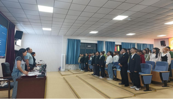 会议伊始,全体参会成员起立,奏唱国歌。在慷慨激昂的国歌声中,本次研究生大会拉开序幕,2023年度院研究生学生会全体大会正式开始。会议第一项:2022-2023年度院学生会主席廖华香做工作总结。第二项:鲁怡冰老师宣读2023-2024年度院学生会干部名单,彭广林、瞿建慧为学生会干部颁发聘书。第三项:学生会干部集体宣誓。最后,2023-2024年度院学生会主席杨笛曼宣读工作计划,强调研究生会要完善制度建设,强化内部管理;夯实日常工作,加大宣传力度;打造品牌活动,彰显研究生会特色。