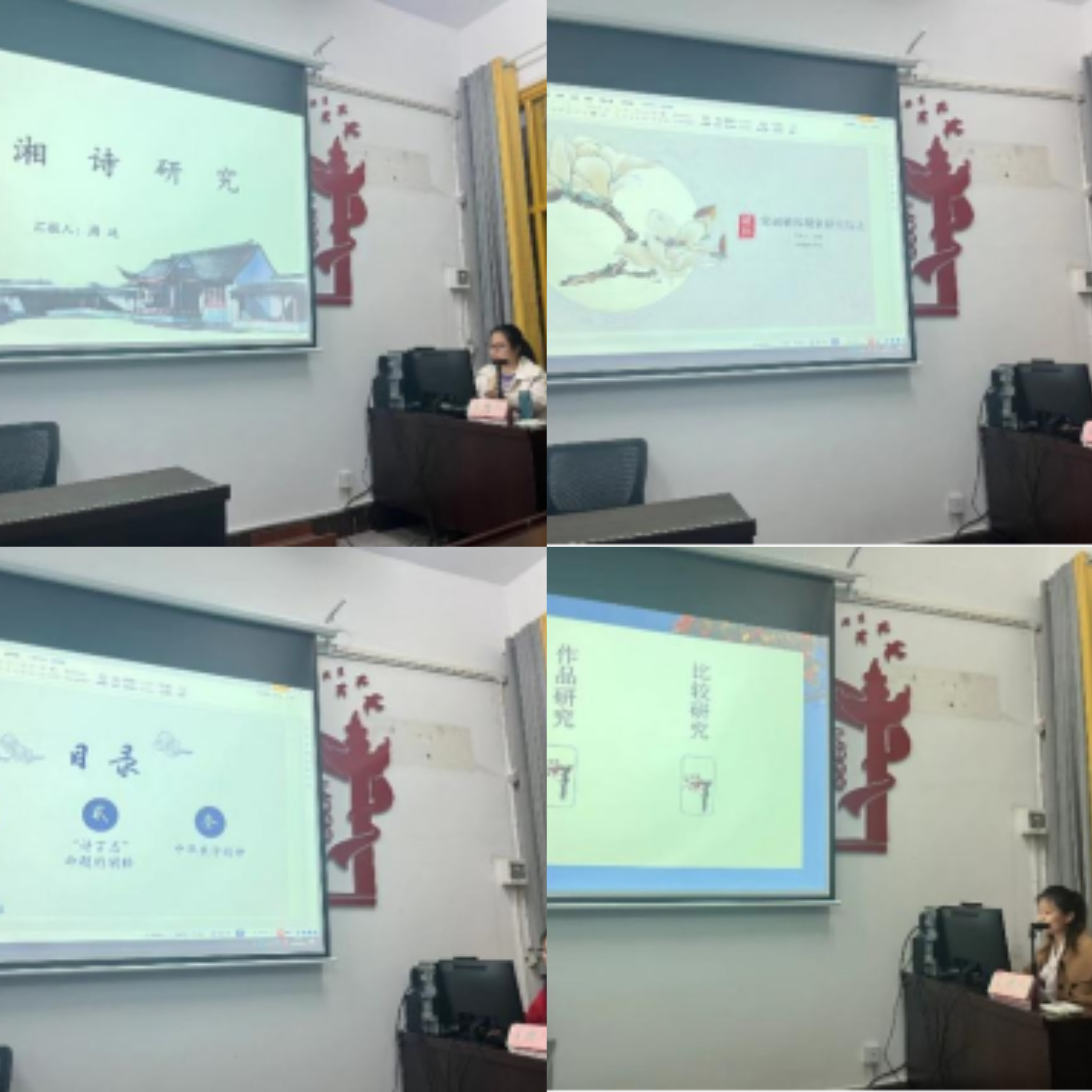 中国语言文学专业周延分享的是“寓湘诗研究”这一专题,她从概念界定、研究现状及感悟思考这三个方面汇报。她认为可以扩大研究范围,比如从寓湘诗研究到寓湘词、寓湘文研究,或者缩小研究范围,比如研究湘西地区的寓湘诗。肖毅分享的是“词体的破体现象研究”这一专题,她从“以诗为词”“以文为词”“以传奇为词”三种“破体”方式汇报。她认为当前的词之破体问题存在重个案而轻整体、文体学意义尚未展开、文体辨体的界限不清晰等问题,有待继续解决。周雨菲分享的是“诗言志与中国美学精神”这一专题,她从古代的文学文论当中去探源属于中国人的独特审美气质、从“志”与“诗”两个方面探讨“诗”如何“言志”、从“诗言志”当中发掘中华民族美学观念三个方面展开汇报。甘海琴分享的是近十年晏殊及其作品研究综述,她从本人研究、作品研究、比较研究三个方面展开汇报。