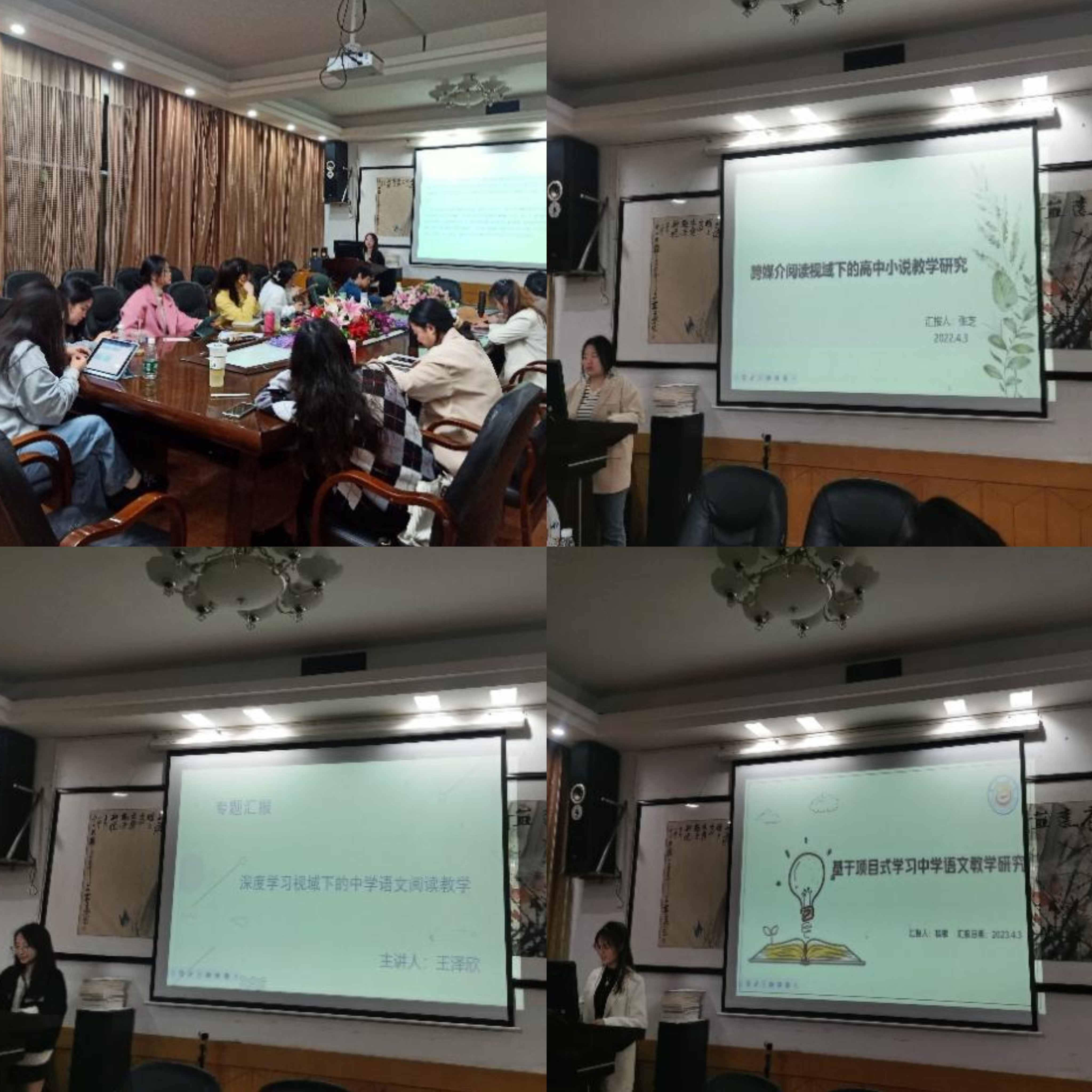 学科语文专业张芝分享的是“跨媒介阅读视域下的高中小说教学研究”这一专题,她从研究缘起、概念界定、研究现状、实施策略和自我收获五个方面展开汇报。她认为:“跨媒介阅读”只是一种学习方式和手段,并不是学习目的,教学的根本在于学习内容,要突出语文核心素养,不能为了跨媒体教学勉强为之。王泽欣分享的是“深度学习视域下的中学语文阅读教学”,她从概述、文献综述、实施策略和总结与思考四个方面展开汇报。她认为:深度学习着重锻炼学生的学习能力,促进高阶思维的发展,要符合核心素养培养目标要求。程银分享的是“基于项目式学习中学语文教学研究”,她从选题概述、文献综述、实施策略和个人思考四个方面展开汇报。她认为:项目化学习可在语文学科与学生语文素养之间铺设通路,需要我们不断地去学习、去突破、去成长。