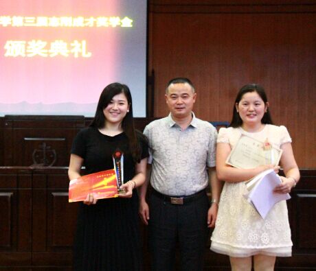 图为 校友总会副会长李荣光为科研奖获得者张晓眉、陈诗颁奖 (安昭旭 摄)