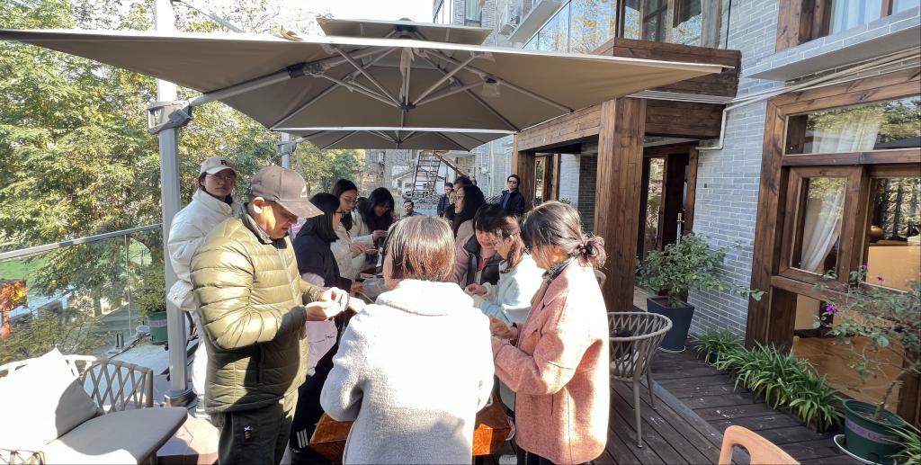 活动伊始,老师们在乾州聚餐阳台上开始包饺子,老师之间相互分工配合,切葱蒜、和面,擀面,揉馅,一一分工完成。女老师们十分熟练地包出了“金元宝”具有喻意吉祥的饺子,男老师们也大胆尝试,包出来的饺子虽形态各异,但是包饺子过程中气氛十分活跃,老师们一边包饺子,一边谈笑风声,相互调侃,现场一片欢笑。