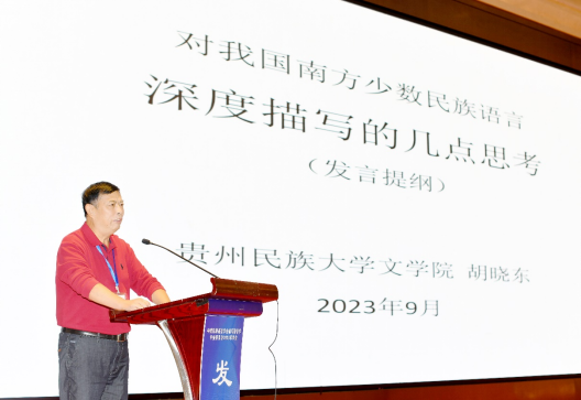 贵州民族大学文学院民语系主任胡晓东教授深度阐释了“描写”二字的含义和描写语言对人类的重要影响,并探讨了共时描写在我国南方少数民族语言调查研究中的重要作用。胡教授还就我国南方少数民族语言调查研究的历史分期作了系统的阐述。