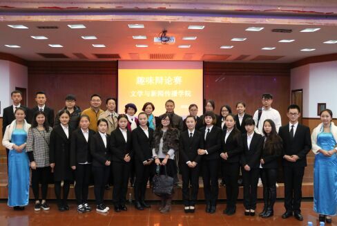 图为在场老师与参赛选手、工作人员合影(杜雨摄) 据悉,本次辩论赛,14级新闻班获优秀班级,周樱、彭芙蓉、乌兰、李新阳等同学获优秀辩手。