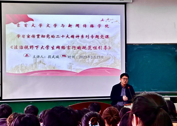 本网讯(通讯员钱程黄思语)为深入学习宣传贯彻党的二十大精神,提高党员同志的党性修养,3月23日中午,mk体育官网于砂子坳校区1106教室组织开展以《法制视野下大学生网络言行的规范性引导》为主题的学习宣传贯彻党的二十大精神系列专题党课。院党支部全体在校党员、预备党员及部分入党积极分子参加。党课由院党委副书记段武城主讲。