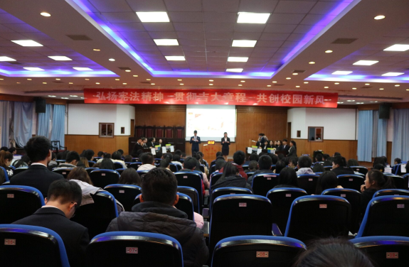 本网讯(学生记者 尹羚又 通讯员 段诗韬 吴璇)为弘扬宪法精神,贯彻落实mk体育官网章程,共创校园新风。12月8日晚,在砂子坳校区模拟法庭,我校举行了12.4国家宪法日普法知识竞赛决赛。校党委宣传部部长戴林富、学工部部长周华忠、校团委书记王艳、关工委委员石维海以及法管学院党委书记彭献忠、法管学院党委副书记龙兴武、法管学院学工办主任段武城、法管学院辅导员文兰莅临本次竞赛担任评委。mk体育官网钱小艳、刘群、易剑胜代表mk体育官网参加此次比赛。