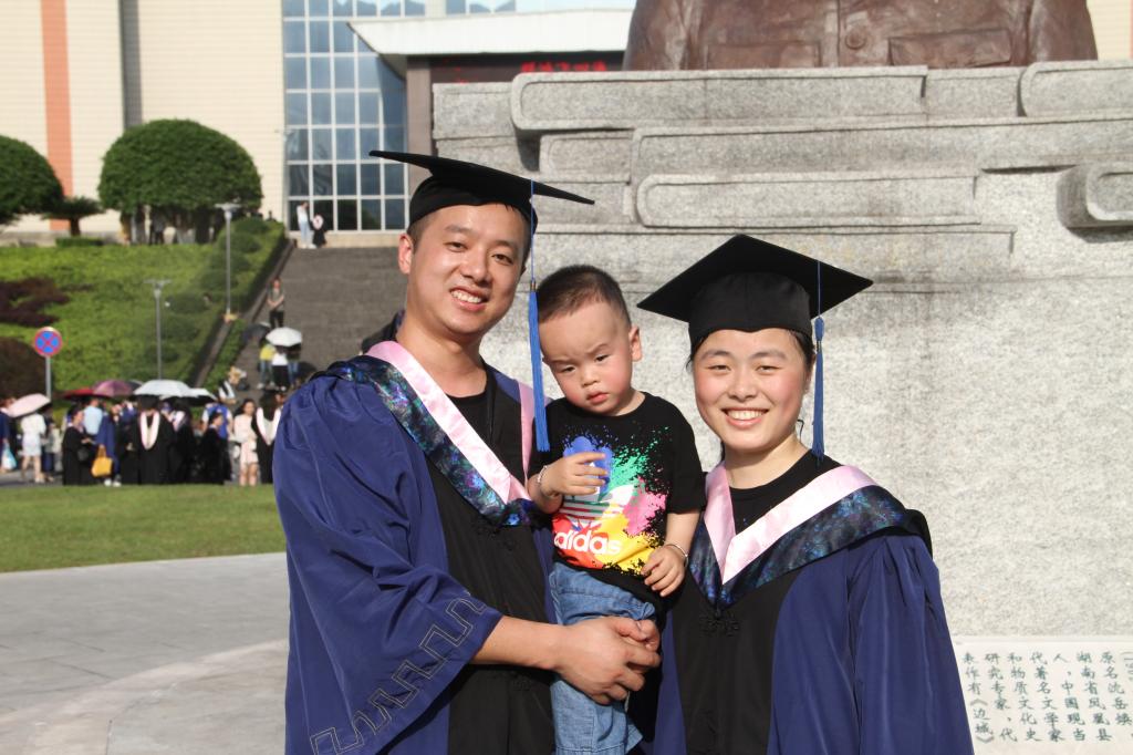 就在文学院毕业生们正准备拍摄毕业照的时候,图书馆前坪突然一阵骚动。镜头推过去,才发现有一位特殊的朋友做客了拍摄现场——一对研究生夫妇抱着他们一岁大的小孩坐到了第一排。
