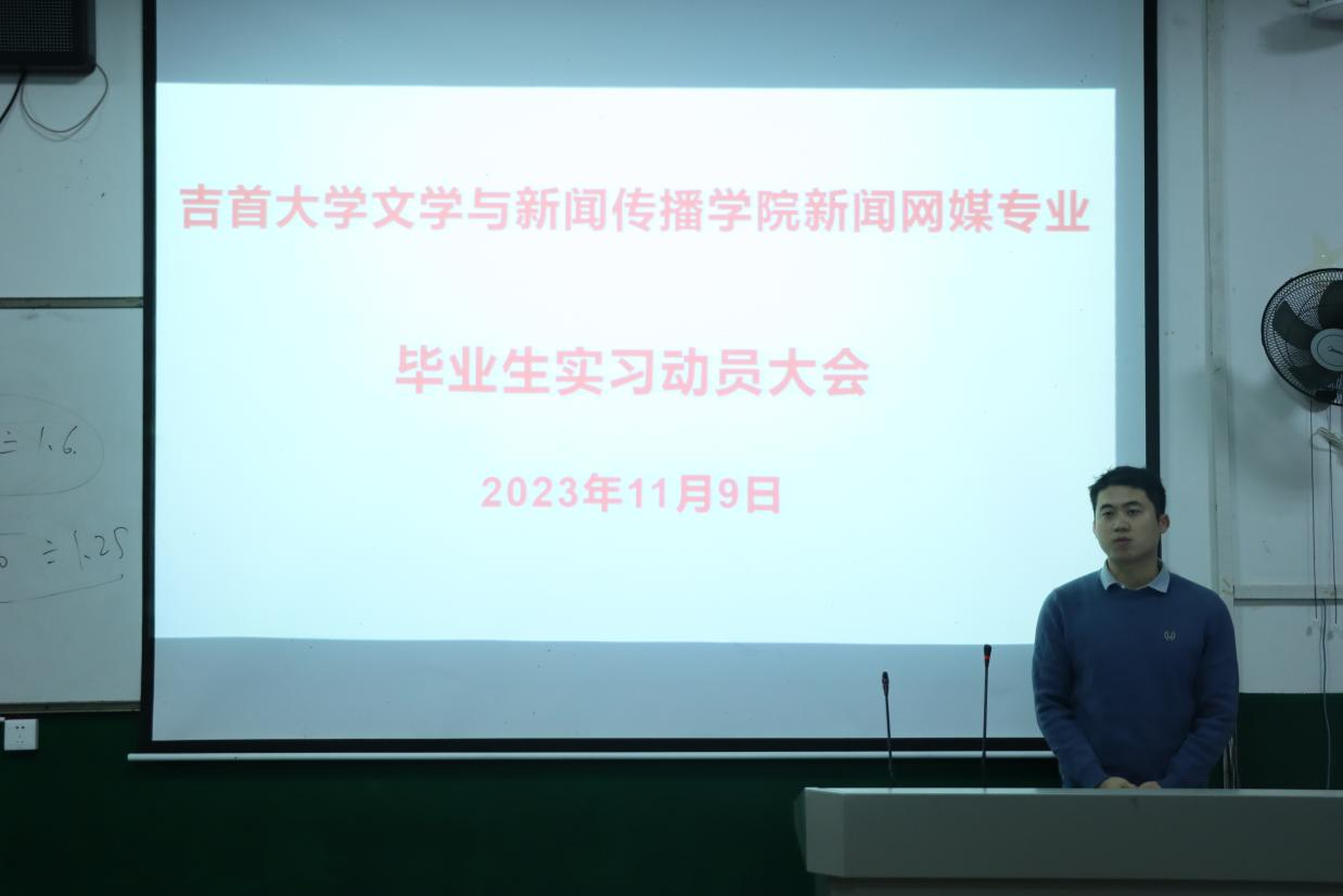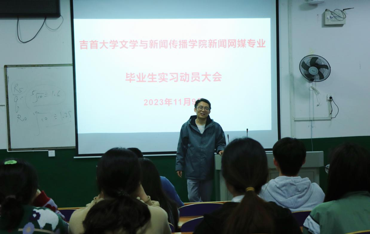 本网讯(通讯员 林静雯 张琦芸)为进一步推动新闻和网媒专业的人才培养,落实学生的毕业去向,11月9日晚,mk体育官网于砂子坳校区第一教学楼1107教室召开2020级新闻和网媒毕业班实习动员大会。网络与新媒体专业主任张冀教授、吴象枢教授,新闻专业主任王作剩博士、20级辅导员刘建新以及新闻、网媒专业毕业生参与此次大会。本次动员大会由刘建新主持。