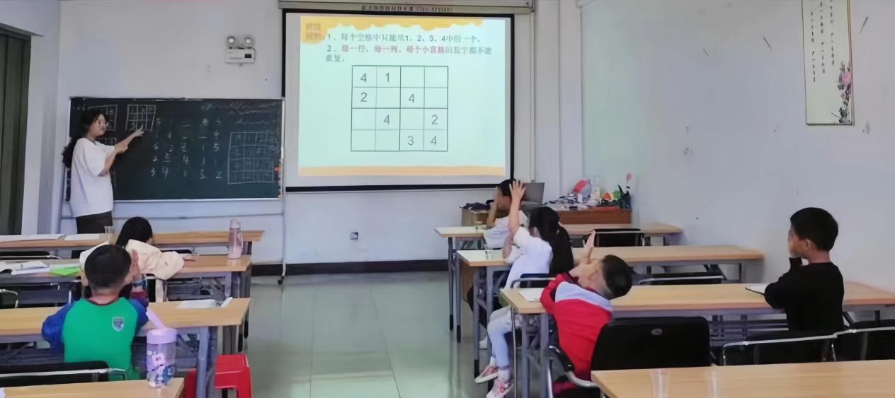 “老师,我下次还来做这个数学游戏!”主教教师寓教于乐,与学生积极互动,借用数学故事、数学谜语等趣味元素活跃课堂氛围。同时,教师们在课上共同开展了移动火柴、烧脑数独等数学益智小游戏,并采取积分“累积+课后兑换”的奖励形式,充分调动学生的学习热情。学生们在轻松愉快的氛围中探索数学的奥秘,寓乐于学,不仅提升了逻辑思维能力,还培养了解决问题的能力。