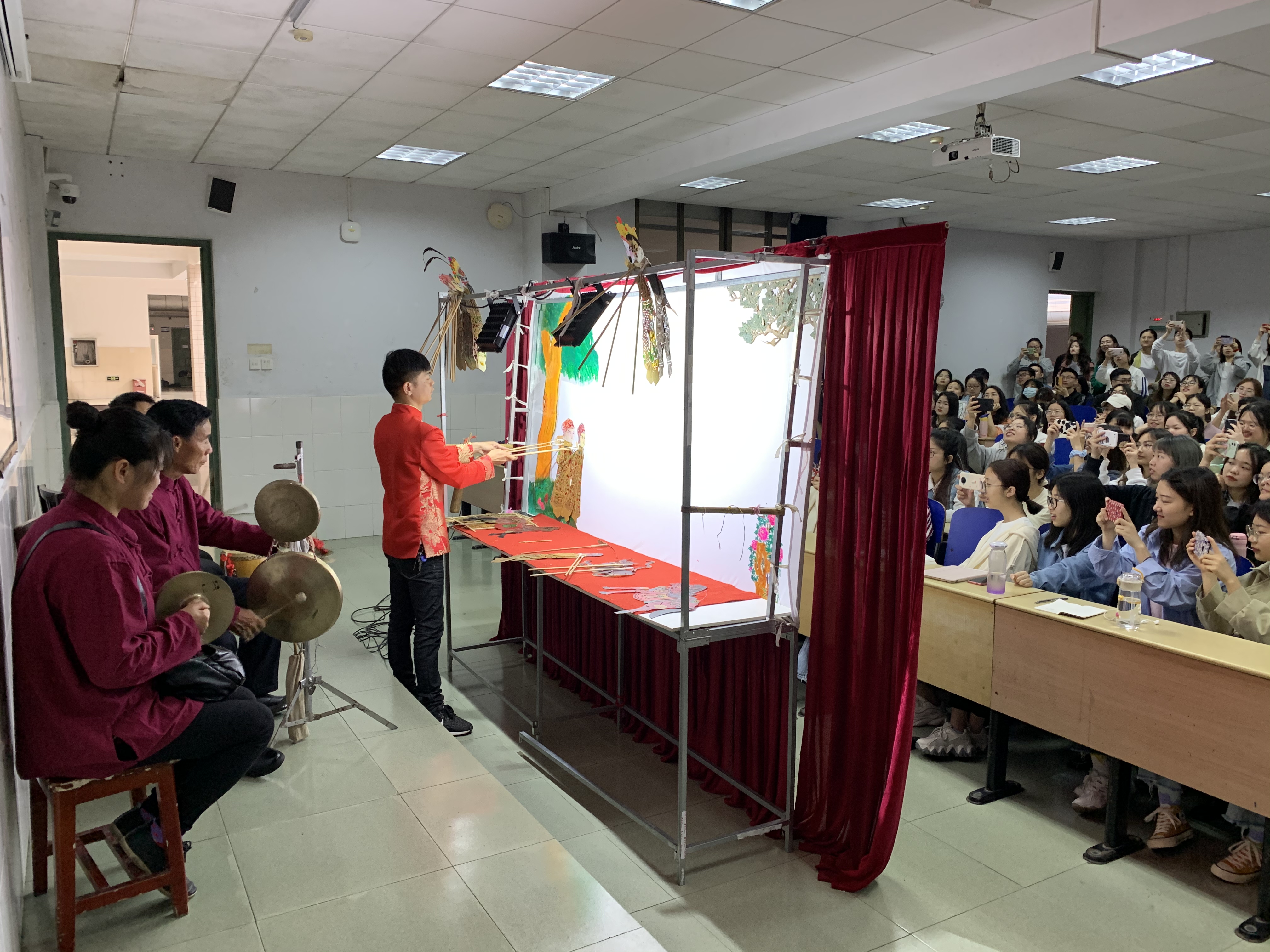 7日上午8时,师生齐聚课堂,用于表演的舞台幕布以及乐器早已准备就绪,朱龙及另三位表演艺术家也换上了表演的专门服饰。朱龙作为益阳朱氏纸影第六代传人,也是湖南省最年轻的纸影传承人,幕布后的他用一双巧手配合富有韵味的唱腔让许多传奇故事再次创新生动呈现,让濒临失传的益阳纸影艺术再绽光芒。伴随着幕布后逐渐欢快激昂的乐器击打声,第一出戏《岳飞抗金救国》徐徐展开,湘剧的曲调从朱龙口中娓娓唱出,幕布上的纸影人物栩栩如生,活灵活现,配合的伴奏时而激昂时而舒缓,富有趣味性的同时,将岳飞之英勇果敢精神展现得淋漓尽致,师生们一阵欢呼鼓掌,纷纷拿起手机拍照录像。演毕,全场掌声雷鸣。朱龙从幕后走到台前向师生简短介绍了纸影器具及特点,并邀请了两名学生亲身体验了一出岳飞骑马抗金骑马作战场景表演,欢乐不断。第二出戏《武松打虎》同样精彩纷呈。《水浒传》里的《武松打虎》作为经典故事,朱龙在此基础上改编了结局,老虎没被打死,而是送到了动物保护区,迎合了当今的人与自然和谐共生的价值观念。这折戏演毕,朱龙向师生展示纸影人物身体部位名称并再次表演了老虎抓掉武松英雄帽的细节,并邀请两名学生上台体验。