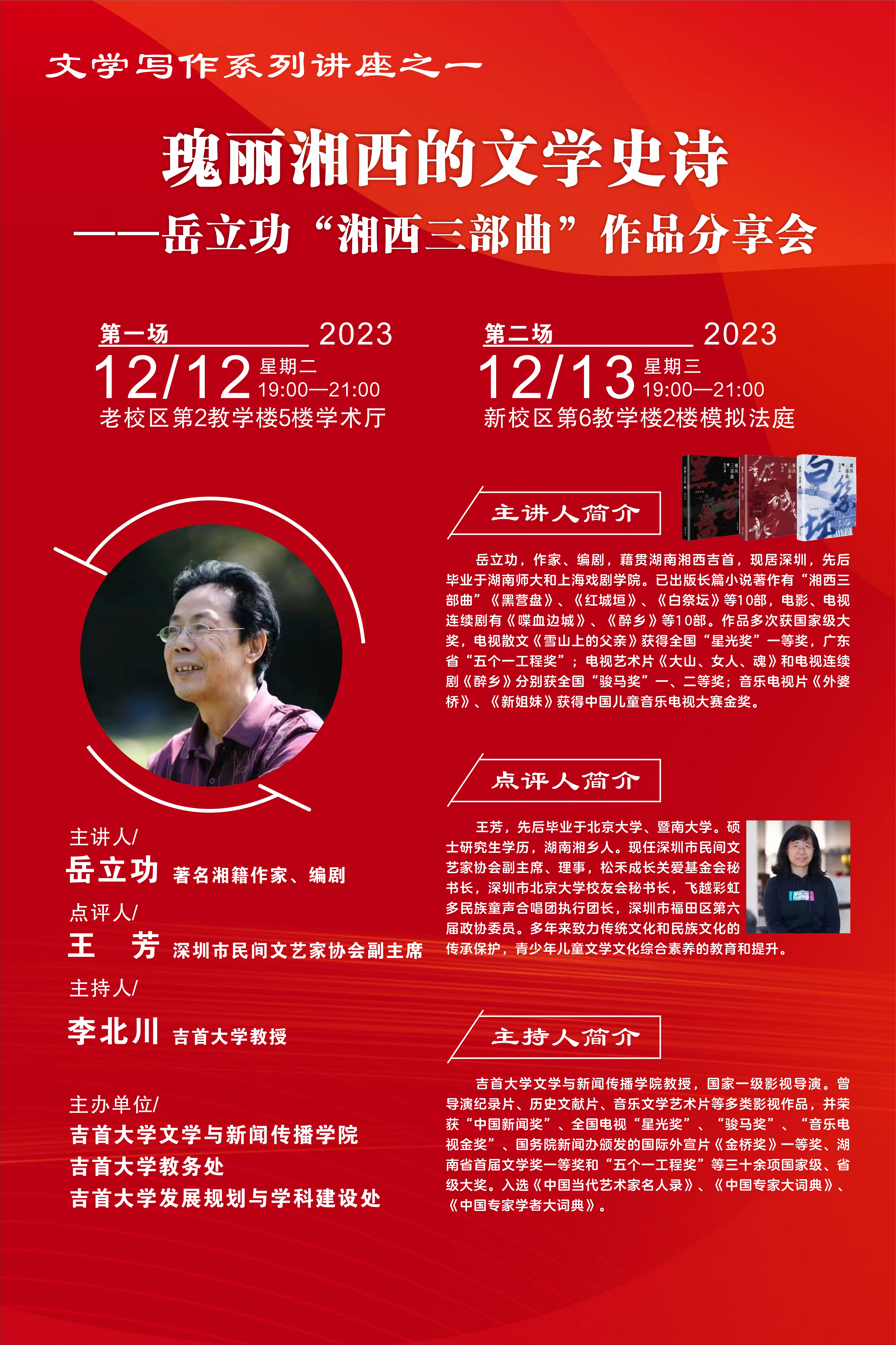 本网讯(通讯员 廖飞 许丹露 唐琛 何佳煦) 12月12日、13日,mk体育官网于大田湾校区学术报告厅和砂子坳校区模拟法庭举行岳立功“湘西三部曲”作品分享会。此次讲座特邀湘籍作家岳立功主讲,mk体育官网党委书记彭广林,副院长罗琼,深圳市民间文艺家协会副主席王芳出席讲座,mk体育官网退休教授李北川主持讲座。