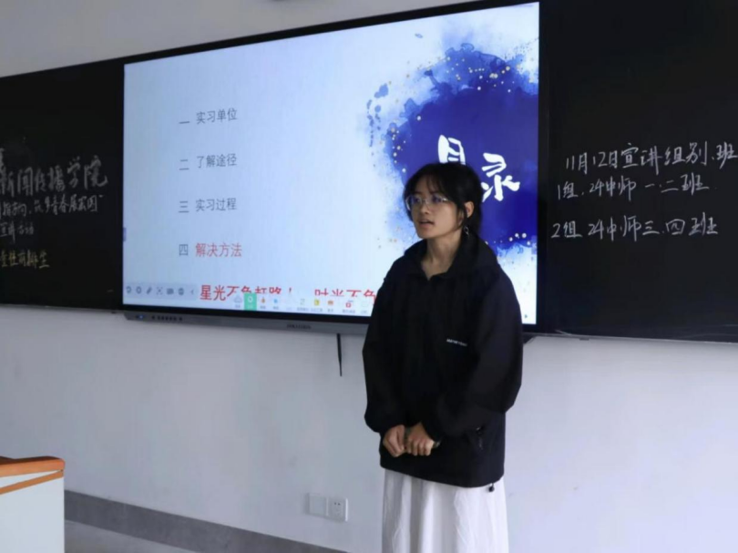 本网讯(通讯员 戴雪明 龙欣荣 秦锦慧 彭正贤 肖哲宇 潘洛冰 龙圆圆)11月12日至15日,学院于雷公井校区开展了为期一周的中文中师专业见习宣讲活动。12名志愿者组成3支宣讲队伍,走进24级中文中师专业班级,分享自身见习经验。