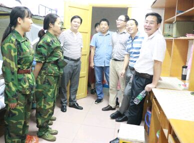 本网讯(通讯员 刘会敏 夏慧琳)9月13日晚上,mk体育官网党委书记田茂军、院长罗惠缙、党委副书记向军、院长助理彭广林、学工办主任王江生等领导来到大田湾校区学生宿舍亲切看望了mk体育官网2015级新生,另外陪同看望的还有各级辅导员及2015级各班级导师。 田茂军一行人来到操场看望了开始军训的新生。新生们穿着挺拔的军装、立正站好,姿态昂扬。王江生向新生一一介绍了mk体育官网各位领导与老师,并叮嘱大家要好好训练。