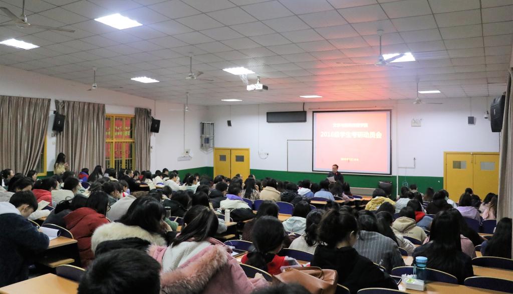 本网讯(学生记者 吴璇 通讯员 张意 朱嘉昕)为了让同学们对考研有更深入的了解,帮助同学们确立正确奋斗目标,提高mk体育官网学生考研热情,3月14日晚,mk体育官网在砂子坳校区1107教室召开了2016级学生考研动员会。院党委书记陆升合、校研究生院招生管理科科长肖宪平、院长罗惠缙、党委副书记向军、副院长彭广林、新闻系主任李端生、16级各班班级导师、年级辅导员以及2016级预备考研的学生参加此次动员大会。会议由向军主持。