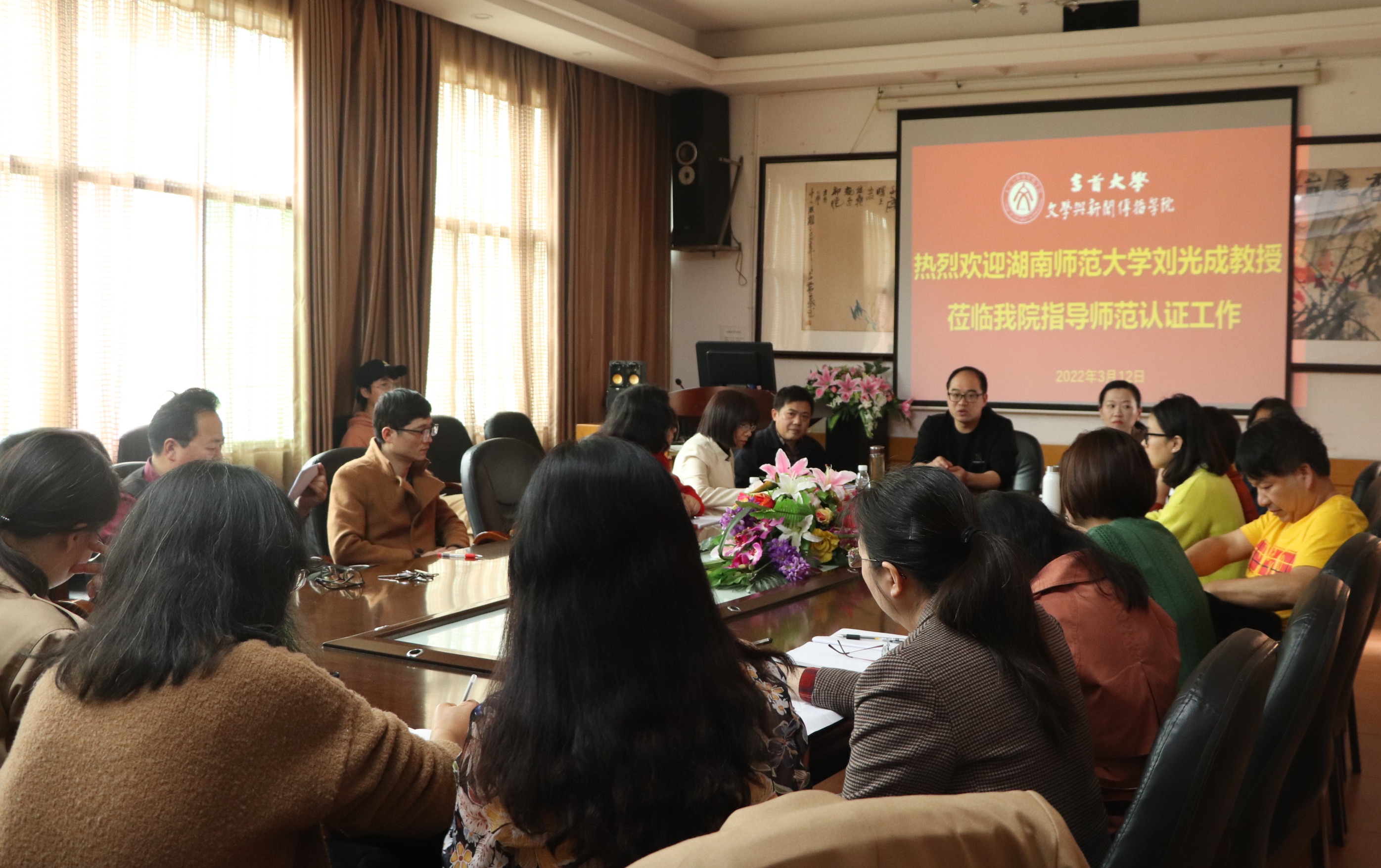 本网讯(学生记者 吴诗明 何可欣)3月12日下午,mk体育官网特邀湖南师范大学刘光成教授于影视鉴赏室召开汉语言师范专业认证指导会。副院长彭广林、汉语言师范专业全体老师出席会议。会议由副院长罗琼主持。