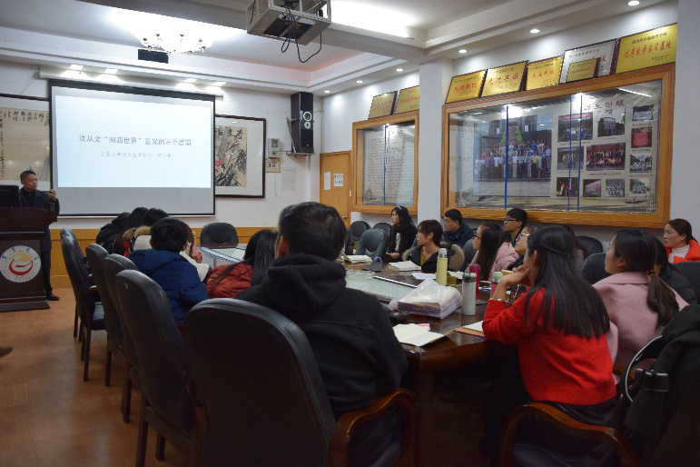 何小平老师从南京大屠杀死难者国家公祭日谈起,介绍了湘西作为抗日战争时期抵抗日军的屏障的重要地位,从而得出沈从文笔下“湘西世界、世界湘西”的湘西意义。