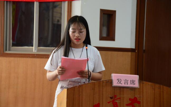 13级中文班石静咏诗作为毕业生党员代表发言。她讲道,作为一名毕业生党员,我们肩负着时代赋予的使命,应该不断用更高的标准来要求自己,向优秀党员学习,不负学院的培养,不负老师们的期望。