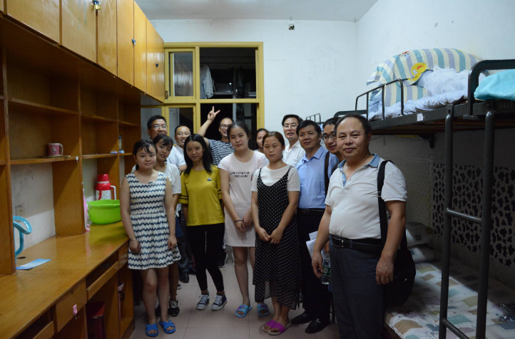 随后,一行人在2017级辅导员刘建新的带领下来到女生宿舍六栋。当天晚上天气闷热,辗转多个寝室,领导老师们的衣服早已被汗浸湿,却没有忽略每一个新生宿舍,“是哪里人呢?”、“什么时候到的?”“坐了多久的车呢?家长陪同来的还是自己来的呢?”领导老师们一遍又一遍地亲切询问,新生们也大方地向老师们介绍自己,向老师们了解自己的专业,介绍自己的家乡等等。在了解到mk体育官网女生住在6至8楼,罗院长表示希望她们能够克服高楼层困难,好好适应大学生活。田书记在看望8楼的新生时幽默地说“住最高层可以每天爬楼梯锻炼锻炼身体。”现场交谈氛围热闹融洽。