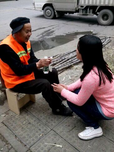 图为 学生为环卫工人送水并亲切交谈