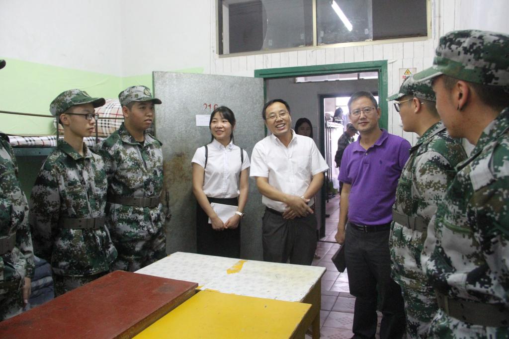 龙先琼一行来到2018级新闻班216号寝室,寝室学生全都穿好军训服严阵以待,向进来的领导老师问好。