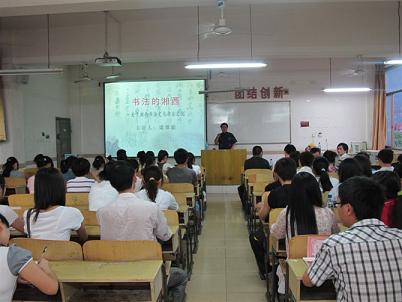 讲座中,梁厚能先生首先结合历史简要阐述了“湘西”的概念,分析了当前湘西书法的研究现状。他说:“湘西不仅有文学大师沈从文、艺术大师黄永玉、歌唱家宋祖英,以及外界神秘的湘西土匪,还有灿烂的书法文化。”他认为,古往今来,湘西的书法艺术活动曾出现五大标志阶段,即以里耶秦简为标志的先秦书法;以溪州铜柱为标志的土司王朝书法;以不二门石刻为代表的清代书法;以书法名家涌现为标志的民国书法;以书法热兴起为标志的当代书法。随后,他通过PPT演示了其利用业余时间,通过大量的田野调查,查阅历史文献资料,走访专家学者、高人村夫而整理出来的各种碑文字帖,加以论证说明。讲座结束之际,他还与在座的师生进行了现场交流。